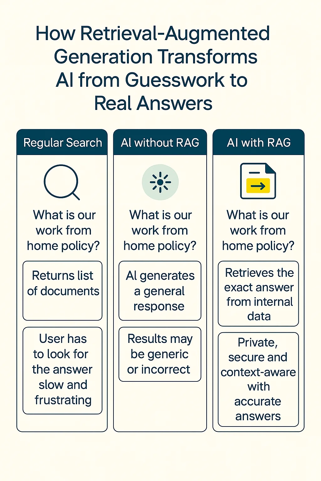 RAG solves this issue by retrieving and referencing accurate, relevant, real-time data directly from your organization's trusted sources; file repositories, Intranet, Client Portal, etc.